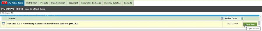- On the My Active Tasks tab, locate the task, “SECURE 2.0 – Mandatory Automatic Enrollment Options (MACA)”.