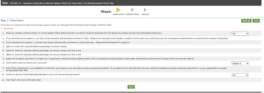 - If TRA does not receive the completed questionnaire by 9/20/2024, we will assume your plan does not require automatic enrollment and it will be your responsibility to notify TRA if your plan meets the MACA requirements and request we amend your plan document to add auto enrollment provisions.