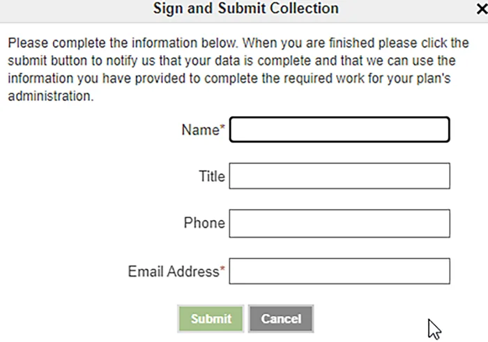 - The pop-up window asks for the name of the individual providing this information, their title, phone number, and email address. Please note that name and email address are required fields. You will then click on the green Submit button. Another pop-up will appear confirming the submission.