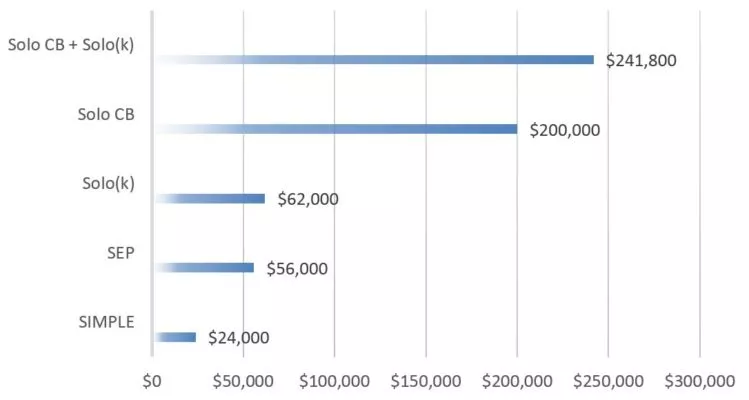 Like any Cash Balance Plan, a Solo CB Plan can help an individual save a substantial amount for retirement over other types of qualified plans. Take a look at this example – a 55-year-old with over $500,000 available for compensation and retirement contributions can save over $200,000 more with a cash balance plan paired with a 401(k) plan, over a SIMPLE IRA.